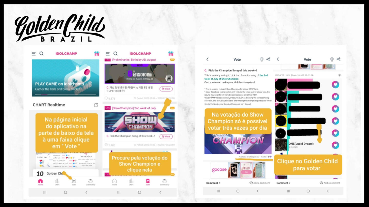 O Idol Champ é um aplicativo (disponível para ambos Android e iOS) para a votação do Show Champion. Siga as imagens abaixo para a votação.